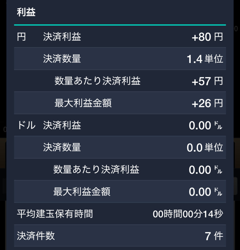本日は秒スキャで8エントリーを実施し、7勝1敗で+3.9pipsを獲得しました。