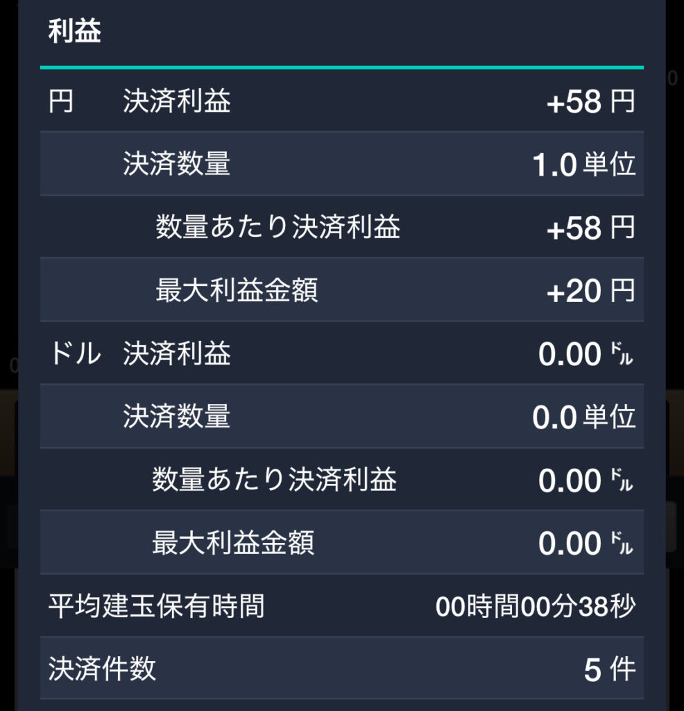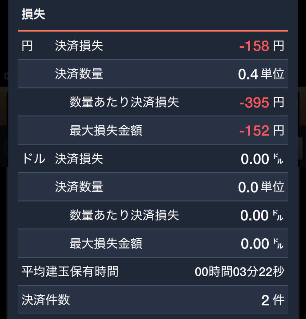 逆張り買いは損切りとなったものの、秒スキャで部分回復し-5.0pipsで終了。